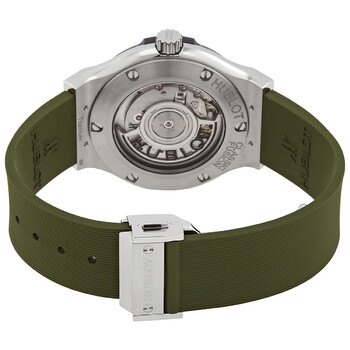 Titanium case with a green rubber strap. Fixed titanium bezel. Green sunray dial with silver-tone hands and index hour markers. Dial Type: Analog. Date display at the 3 o'clock position. Hublot Calibre HUB1110 Automatic movement, based upon Sellita SW300-1, containing 21 Jewels, composed of 63 parts, bitting at 28800 vph, and has a power reserve of approximately 42 hours. Scratch resistant sapphire crystal. Pull / push crown. Transparent case back. Round case shape, case size: 38 mm. Deployant buckle clasp. Water resistant at 50 meters / 165 feet. Functions: date, hour, minute, second. Classic Fusion Series. Luxury watch style. Watch label: Swiss Made. Hublot Classic Fusion Titanium Automatic Green Dial Unisex Watch 565.NX.8970.RX.