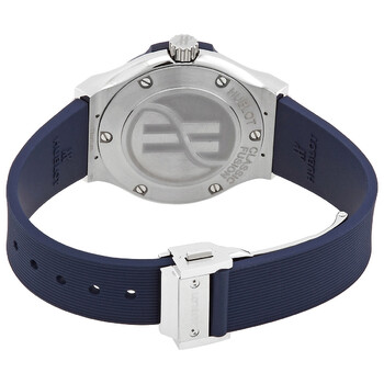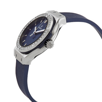 Titanium case with a blue rubber strap. Fixed titanium bezel set with diamonds. Blue dial with silver-tone hands and index hour markers. Dial Type: Analog. Date display at the 3 o'clock position. Hublot Calibre HUB2912 quartz movement. Scratch resistant sapphire crystal. Solid case back. Round case shape, case size: 33 mm. Deployant buckle clasp. Water resistant at 50 meters / 165 feet. Functions: date, hour, minute, second. Classic Fusion Series. Luxury watch style. Watch label: Swiss Made. Hublot Classic Fusion Titanium Quartz Diamond Blue Dial Ladies Watch 581.NX.7170.RX.1104.