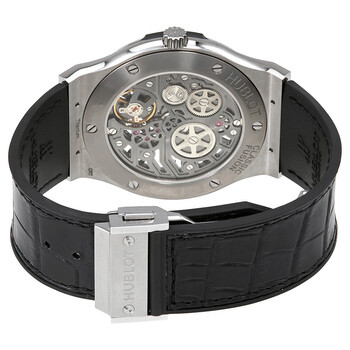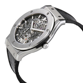 Polished and satin-finished titanium case with a black (alligator) rubber strap. Fixed, brushed titanium bezel. Skeleton dial with polished rhodium-plated appliques with rhodium-plated hands and index hour markers. 60 seconds sub-dial at the 7 o'clock position. Hand Wind movement with a 90-hour power reserve. Scratch resistant sapphire crystal. Fluted, screw down crown. Transparent case back. Case diameter: 45 mm. Round case shape. Deployment clasp with a push button release. Water resistant at 50 meters / 165 feet. Functions: hour, minute, small seconds, 90 hour power reserve. Luxury watch style. Watch label: Swiss Made. Hublot Classic Fusion Ultra-Thin Skeleton Men's Watch 515.NX.0170.LR.