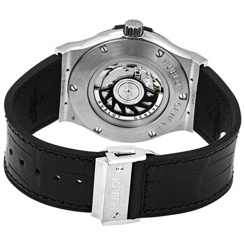 Zirconium case with a black (alligator) (gummy backed) leather strap. Fixed zirconium bezel set with 126 diamonds. Black dial with silver-tone skeleton hands and index hour markers. Dial Type: Analog. Date display at the 3 o'clock position. Hublot calibre HUB 1112 automatic movement with a 42-hour power reserve. Scratch resistant sapphire crystal. Screw down crown. Transparent case back. Round case shape. Case size: 45 mm. Case thickness: 10.5 mm. Strap width: 22 mm. Deployant clasp. Water resistant at 50 meters / 165 feet. Functions: date, hour, minute, second. Additional Info: bezel set with 126 diamonds (1.60ct). Luxury watch style. Watch label: Swiss Made. Item Variations: 511 ZX 1170 LR 1104, 511-ZX-1170-LR-1104, 511/ZX/1170/LR/1104, 511ZX1170LR1104. Hublot Classic Fusion Zirconium Automatic Black Dial Men's Watch 511.ZX.1170.LR.1104.