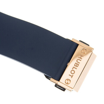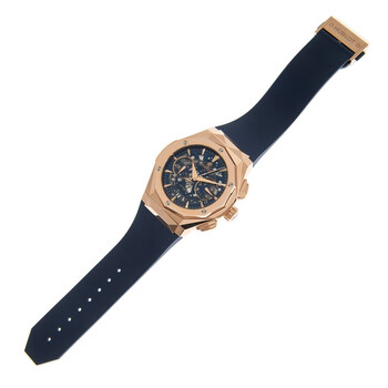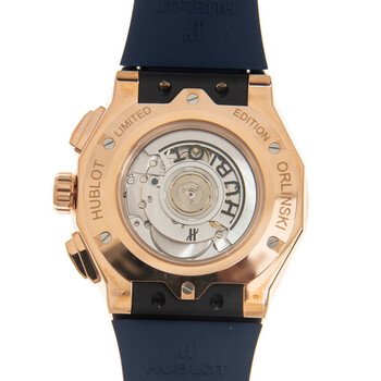 Gold-tone 18kt rose gold case with a blue rubber strap. Fixed 18kt rose gold bezel. Blue dial with index hour markers. Dial Type: Analog. Date display at the 6 o'clock position. Chronograph - two sub-dials displaying: 60 second and 30 minute. Hublot Calibre HUB1155 Automatic movement, based upon ETA 2892, containing 60 Jewels, composed of 207 parts, bitting at 28800 vph, and has a power reserve of approximately 42 hours. Scratch resistant sapphire crystal. Screw down crown. Transparent see through case back. Dodecagon case shape, case size: 45 mm. Deployment with push button release clasp. Water resistant at 50 meters / 165 feet. Functions: chronograph, date, hour, minute, second. Additional Info: original box, international warranty card, manual (complete accessories). Classic Fusion Series. Luxury watch style. Watch label: Swiss Made. Hublot Classic FusionAaerofusion Orlinski Chronograph Automatic Blue Dial Men's Watch 525OX5180RXORL21.