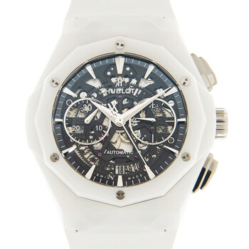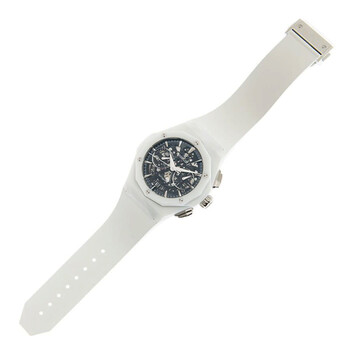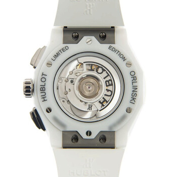 White ceramic case with a white rubber strap. Fixed white ceramic bezel. Transparent dial with silver-tone hands and index hour markers. Minute markers around the outer rim. Dial Type: Analog. Date display at the 6 o'clock position. Chronograph - two sub-dials displaying: 60 second and 30 minute. Hublot Calibre HUB1155 Automatic movement, based upon ETA 2892, containing 60 Jewels, composed of 207 parts, bitting at 28800 vph, and has a power reserve of approximately 42 hours. Scratch resistant sapphire crystal. Screw down crown. Transparent see through case back. Dodecagon case shape, case size: 45 mm. Deployment with push button release clasp. Water resistant at 50 meters / 165 feet. Functions: chronograph, date, hour, minute, second. Additional Info: original box, international warranty card, manual (complete accessories). Classic Fusion Series. Luxury watch style. Watch label: Swiss Made. Hublot Classic FusionAaerofusion Orlinski Chronograph Automatic Men's Watch 525.HI.0170.RW.ORL21.