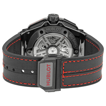 Satin-finished black ceramic case with a black leather strap. Fixed black ceramic bezel. Black/grey openwork dial with black hands and alternating stick and Arabic numeral hour markers. Minute markers around the outer rim. Dial Type: Analog. Luminescent hands and markers. Date display appears at the 3 o'clock position. Small seconds sub-dial at the 3 o'clock position. Automatic movement. Hub 1241 engine. Scratch resistant sapphire crystal. Screw down crown. Skeleton case back. Case diameter: 45 mm. Round case shape. Deployment with push button clasp. Water resistant at 100 meters / 330 feet. Functions: date, hour, minute, second. Additional Info: limited edition of 1000 pieces. Luxury watch style. Watch label: Swiss Made. Item Variations: 401 CX 0123 VR, 401-CX-0123-VR, 401/CX/0123/VR, 401CX0123VR. Hublot Ferrari All Black LIMITED Automatic Openwork Dial Black Ceramic Men's Watch.