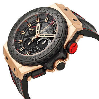 18kt rose gold case with a black leather strap. Fixed black ceramic bezel. Black and grey dial with skeleton hands and index hour markers. Minute markers around the outer rim. Dial Type: Analog. Date display between 4 and 5 o'clock position. Chronograph - three sub-dials displaying: 60 second, 30 minute and 12 hour. Hublot Calibre HUB4100 Automatic movement, based upon ETA 2894-2, containing 27 Jewels, composed of 252 parts, bitting at 28800 vph, and has a power reserve of approximately 42 hours. Scratch resistant sapphire crystal. Pull / push crown. Round case shape, case size: 48 mm. Band length: 9 inches. Deployment with push button release clasp. Water resistant at 100 meters / 330 feet. Functions: chronograph, date, hour, minute, second. Additional Info: limited edition of 250 pieces. King Power Series. Luxury watch style. Watch label: Swiss Made. Item Variations: 703 OM 6912 HR FMC12, 703-OM-6912-HR-FMC12, 703OM6912HRFMC12. Hublot King Power Automatic Black Dial 18kt Rose Gold Men's Watch 703.OM.6912.HR.FMC12.
