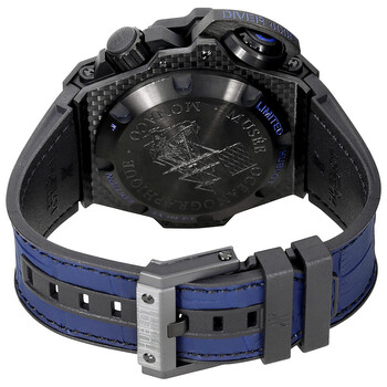 Black carbon fiber case with a grey rubber strap with a (stiched) blue (calfskin) leather top. Fixed black carbon fiber bezel. Black dial with luminous blue hands and index hour markers. Arabic numeral minute markers (at 10 minute intervals). Minute markers around the outer rim. Dial Type: Analog. Luminescent hands and markers. Date display at the 3 o'clock position. Hublot calibre HUB1401 automatic movement, containing 23 Jewels, composed of 180 parts, bitting at 28800 vph, and has a power reserve of approximately 42 hours. Scratch resistant sapphire crystal. Screw down crown. Solid case back. Round case shape. Case size: 48 mm. Case thickness: 22.4 mm. Band width: 20.3 mm. Band length: 8 inches. Tang clasp. Water resistant at 4000 meters / 13120 feet. Functions: date, hour, minute, second. Additional Info: limited numbered edition of 500. King Power Oceanographic Series. Dive watch style. Watch label: Swiss Made. Item Variations: 731 QX 1190 GR ABB12, 731-QX-1190-GR-ABB12, 731QX1190GRABB12. Hublot King Power Oceanographic Men's Watch 731.QX.1190.GR.ABB12.