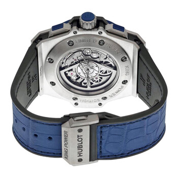 Satin-finish titanium case with a dark blue gummy alligator strap. Fixed blue carbon fiber and rubber bezel. Skeleton dial with skeleton hands and index hour markers. Minute markers around the outer rim. Dial Type: Analog. Date display between 4 and 5 o'clock position. Chronograph - two sub-dials displaying: 60 second and 30 minute. Automatic movement. Scratch resistant sapphire crystal. Case diameter: 48 mm. Round case shape. Deployant clasp. Functions: chronograph, date, hour, minute, second. Luxury watch style. Watch label: Swiss Made. Hublot King Power Special One Skeleton Dial Chronograph Automatic Men's Watch 701NQ0137GRSPO14.