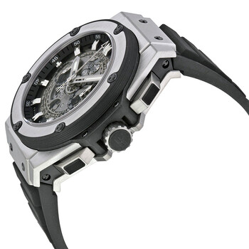 Titanium case with a black rubber strap. Fixed titanium bezel. Skeletonized dial with luminous hands and index hour markers. Minute markers around the outer rim. Dial Type: Analog. Date display between the 4 and 5 o'clock positions. Chronograph - two sub-dials displaying: 60 second and 60 minute. Hublot calibre HUB1240 automatic movement with a 72-hour power reserve. Scratch resistant sapphire crystal. Screw down crown. Screw down case back. Round case shape. Case size: 48 mm. Case thickness: 17.60 mm. Band width: 20.3 mm. Band length: 8 inches. Deployment clasp. Water resistant at 100 meters / 330 feet. Functions: chronograph, date, hour, minute, second. Luxury watch style. Watch label: Swiss Made. Item Variations: 701 NX 0170 RX, 701-NX-0170-RX, 701/NX/0170/RX, 701NX0170RX. Hublot King Power Unico Skeleton Dial Titanium Men's Watch 701.NX.0170.RX.