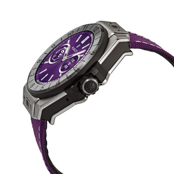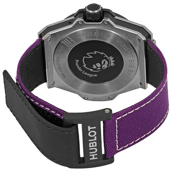 Grey titanium case with a purple fabric strap. Fixed grey titanium bezel. Digital dial with Arabic numeral hour markers. Dial Type: digital. Automatic movement with a 24-hour power reserve. Scratch resistant sapphire crystal. Solid case back. Round case shape. Case size: 42 mm. Slip through clasp. Water resistant at 30 meters / 100 feet. Limited Edition Big Bang E Premier League Series. Sport watch style. Hublot Limited Edition Big Bang E Premier League Digital Men's Watch 440.NX.1100.NR.PLW21.