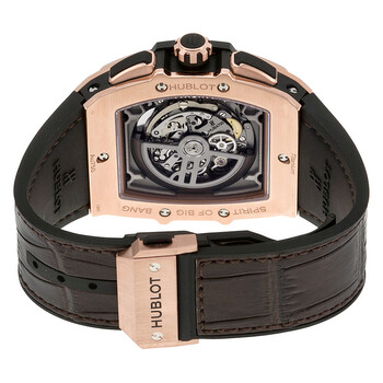 Satin-finished 18kt king gold case with a brown leather strap. Fixed 18kt king gold bezel set with diamonds. Black (skeleton center) dial with luminous king gold hands and index hour markers. Minute markers around the outer rim. Dial Type: Analog. Luminescent hands and markers. Date display between the 4 and 5 o'clock positions. Hublot calibre HUB4700 automatic movement, containing 31 Jewels, composed of 278 parts, bitting at 36000 vph, and has a power reserve of approximately 50 hours. Scratch resistant sapphire crystal. Pull / push crown. Transparent case back. Tonneau case shape. Case dimensions: 51 mm x 45 mm. Deployment clasp. Water resistant at 100 meters / 330 feet. Functions: chronograph, date, hour, minute, second. Spirit Of Big Bang Series. Luxury watch style. Watch label: Swiss Made. Item Variations: 601 OX 0183 LR 1104, 601-OX-0183-LR-1104, 601/OX/0183/LR/1104, 601OX0183LR1104. Hublot Spirit of Big Bang 18kt King Gold Diamond Men's Watch 601.OX.0183.LR.1104.