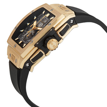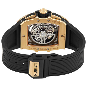 18kt yellow gold case with a black rubber strap. Fixed 18kt yellow gold bezel. Skeleton dial with gold-tone hands and index hour markers. Minute markers around the outer rim. Dial Type: Analog. Luminescent hands and markers. Date display between 4 and 5 o'clock position. Chronograph - three sub-dials displaying: 60 second, 30 minute and 12 hour. Hublot Calibre HUB4700 Automatic movement, containing 31 Jewels, composed of 278 parts, bitting at 36000 vph, and has a power reserve of approximately 50 hours. Scratch resistant sapphire crystal. Transparent case back. Tonneau case shape, case size: 42 mm. Deployant buckle clasp. Water resistant at 100 meters / 330 feet. Functions: chronograph, date, hour, minute, second. Spirit Of Big Bang Series. Luxury watch style. Watch label: Swiss Made. Hublot Spirit Of Big Bang 18kt Yellow Gold Chronograph Automatic Men's Watch 642.VX.0130.RX.