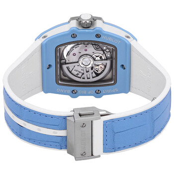 Blue ceramic case with a blue alligator & rubber strap. Fixed bezel with diamond set. Blue dial with silver-tone hands and index hour markers. Dial Type: Analog. Luminescent hands and markers. Date display at the 6 o'clock position. Hublot Calibre HUB1710 Automatic movement, based upon Zenith Elite 670, containing 27 Jewels, bitting at 28800 vph, and has a power reserve of approximately 50 hours. Scratch resistant sapphire crystal. Pull / push crown. Tonneau case shape, case size: 39 mm. Deployant buckle clasp. Water resistant at 100 meters / 330 feet. Functions: date, hour, minute, second. Additional Info: bezel set with 50 diamonds (1.00cts). Spirit Of Big Bang Series. Luxury watch style. Watch label: Swiss Made. Hublot Spirit Of Big Bang Automatic Diamond Blue Dial Ladies Watch 665.EN.891L.LR.1204.