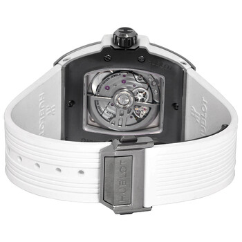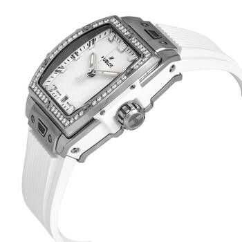 Titanium case with a white rubber strap. Fixed titanium bezel set with 50 diamonds totaling 1.0ct. Matte white dial with silver-tone hands and index hour markers. Minute markers around the outer rim. Dial Type: Analog. Luminescent hands and markers. Date display at the 6 o'clock position. Hublot Calibre HUB1710 Automatic movement, based upon Zenith Elite 670, containing 27 Jewels, bitting at 28800 vph, and has a power reserve of approximately 50 hours. Scratch resistant sapphire crystal. Transparent case back. Tonneau case shape, case size: 39 mm. Deployant buckle clasp. Water resistant at 100 meters / 330 feet. Functions: date, hour, minute, second. Spirit Of Big Bang Series. Luxury watch style. Watch label: Swiss Made. Hublot Spirit Of Big Bang Automatic Diamond White Dial Ladies Watch 662.NE.2010.RW.1204.
