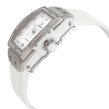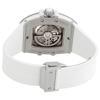 Titanium case with a white rubber strap. Fixed titanium bezel set with diamonds. Matte white dial with luminous silver-tone hands and index hour markers. Minute markers around the outer rim. Dial Type: Analog. Luminescent hands and markers. Date display at the 6 o'clock position. Hublot calibre HUB1710 automatic movement, based upon Zenith Elite 670, containing 27 Jewels, bitting at 28800 vph, and has a power reserve of approximately 50 hours. Scratch resistant sapphire crystal. Pull / push crown. Tonneau case shape. Case size: 39 mm. Deployment clasp. Water resistant at 100 meters / 330 feet. Functions: date, hour, minute, second. Additional Info: bezel set with 50 diamonds (1.0ct). Spirit Of Big Bang Series. Luxury watch style. Watch label: Swiss Made. Hublot Spirit of Big Bang Automatic Men's Watch 665.NE.2010.RW.1204.