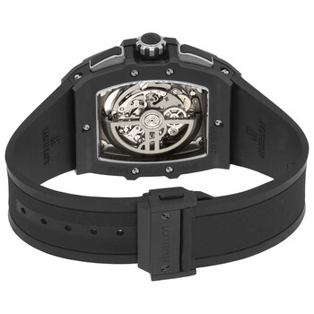 Black microblasted ceramic case with a black lined rubber strap. Fixed black ceramic bezel. Skeleton dial with silver-tone hands and index hour markers. Minute markers around the outer rim. Dial Type: Analog. Luminescent hands and markers. Date display between 4 and 5 o'clock position. Chronograph - three sub-dials displaying: 60 second, 30 minute and 12 hours. Hublot Calibre HUB4700 Automatic movement, containing 31 Jewels, composed of 278 parts, bitting at 36000 vph, and has a power reserve of approximately 50 hours. Scratch resistant sapphire crystal. Transparent see through case back. Tonneau case shape, case size: 45 mm. Deployant clasp. Water resistant at 100 meters / 330 feet. Functions: chronograph, date, hour, minute, second. Spirit Of Big Bang Black Magic Series. Luxury watch style. Watch label: Swiss Made. Hublot Spirit Of Big Bang Black Magic Chronograph Automatic Men's Watch 641.CI.0173.RX.