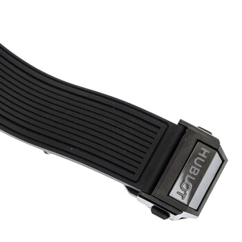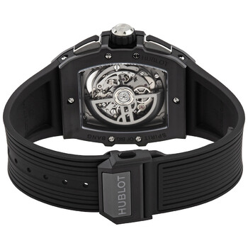 Ceramic case with a black rubber strap. Fixed microblasted black ceramic bezel. Skeleton dial with index hour markers. Dial Type: Analog. Date display between 4 and 5 o'clock position. Chronograph - three sub-dials displaying: 60 second, 30 minute and 12 hour. Hublot Calibre HUB4700 Automatic movement, containing 31 Jewels, composed of 278 parts, bitting at 36000 vph, and has a power reserve of approximately 50 hours. Scratch resistant sapphire crystal. Transparent see through case back. Tonneau case shape, case size: 42 mm. Tang clasp. Water resistant at 100 meters / 330 feet. Functions: chronograph, date, hour, minute, second. Spirit Of Big Bang Series. Luxury watch style. Watch label: Swiss Made. Hublot Sspirit of Big Bang Black Magic Chronograph Automatic Men's Watch 642.CI.0170.RX.