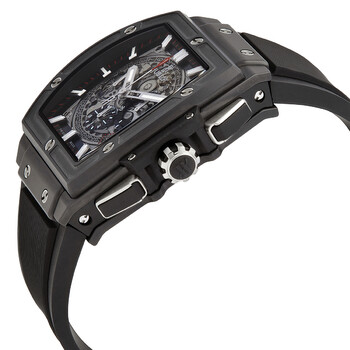 Black ceramic case with a black (structured lined) rubber strap. Fixed black ceramic bezel. Silver skeleton dial with luminous silver-tone hands and index hour markers. Minute markers around the outer rim. Dial Type: Analog. Luminescent hands and markers. Date display between the 4 and 5 o'clock positions. Chronograph - three sub-dials displaying: 60 second, 30 minute and 12-hour. Hublot calibre HUB4700 automatic movement, bitting at 36000 vph, and has a power reserve of approximately 50 hours. Scratch resistant sapphire crystal. Pull / push crown. Transparent case back. Tonneau case shape. Case dimensions: 51 mm x 45 mm. Black-plated titanium deployant clasp. Water resistant at 50 meters / 165 feet. Functions: chronograph, date, hour, minute, second. Spirit Of Big Bang Series. Luxury watch style. Watch label: Swiss Made. Hublot Spirit of Big Bang Chronograph Automatic Men's Watch 601.CI.0173.RX.