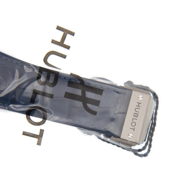 Grey titanium case with a blue rubber strap with a blue (alligator) leather top. Fixed grey titanium bezel. Lateral case center bezel lugs of blue composite resin. Skeleton dial with luminous silver-tone hands and index hour markers. Minute markers around the outer rim. Dial Type: Analog. Luminescent hands and markers. Date display between 4 and 5 o'clock position. Chronograph - three sub-dials displaying: 60 second, 30 minute and 12 hour. Hublot calibre HUB4700 automatic movement, containing 31 Jewels, composed of 278 parts, bitting at 36000 vph, and has a power reserve of approximately 50 hours. Scratch resistant sapphire crystal. Pull / push crown. Transparent case back. Tonneau case shape. Case dimensions: 51 mm x 45 mm. Deployment clasp with a push button release. Water resistant at 100 meters / 330 feet. Functions: chronograph, date, hour, minute, second. Spirit Of Big Bang Series. Luxury watch style. Watch label: Swiss Made. Hublot Spirit Of Big Bang Chronograph Automatic Men's Watch 601.NX.7170.LR.