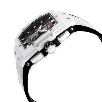 White (microblasted) ceramic case with a black rubber strap with a (stiched) white (alligator) leather top. Fixed white (microblasted) ceramic bezel. Sapphire dial with luminous silver-tone hands and index hour markers. Minute markers around the outer rim. Dial Type: Analog. Luminescent hands and markers. Date display between the 4 and 5 o'clock positions. Chronograph - sub-dials displaying: white. Caliber HUB4700 automatic movement with a 50-hour power reserve. Scratch resistant sapphire crystal. Screw down crown. Transparent case back. Tonneau case shape. Case size: 42 mm. Case thickness: 14.5 mm. Stainless steel deployant clasp. Water resistant at 100 meters / 330 feet. Functions: chronograph, date, hour, minute, second. Spirit Of Big Bang Series. Luxury watch style. Watch label: Swiss Made. Hublot Spirit of Big Bang Chronograph Automatic Men's Watch 641.HX.0173.LR.