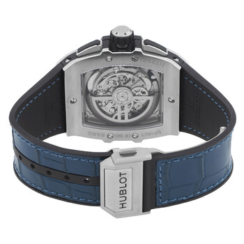 Satin-finished titanium case with a blue alligator leather strap. Fixed satin-finished titanium bezel. Sapphire dial with luminous silver-tone hands and index hour markers. Minute markers around the outer rim. Dial Type: Analog. Luminescent hands and markers. Date display between 4 and 5 o'clock position. Chronograph - three sub-dials displaying: 60 second, 30 minute and 12 hour. Hublot Calibre HUB4700 Automatic movement, containing 31 Jewels, composed of 278 parts, bitting at 36000 vph, and has a power reserve of approximately 50 hours. Scratch resistant sapphire crystal. Transparent case back. Tonneau case shape, case size: 42 mm. Folding clasp. Water resistant at 100 meters / 330 feet. Functions: chronograph, date, hour, minute, second. Spirit Of Big Bang Series. Luxury watch style. Watch label: Swiss Made. Hublot Spirit Of Big Bang Chronograph Automatic Men's Watch 642.NX.7170.LR.