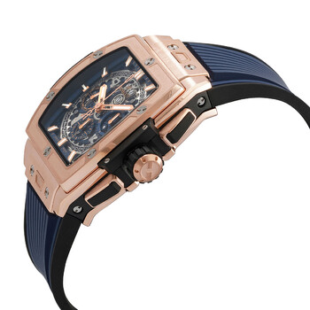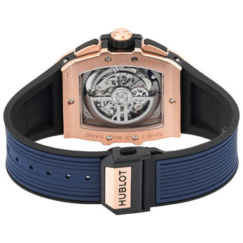 18kt rose gold case with a blue rubber strap. Fixed 18kt rose gold bezel. Sapphire dial with rose gold hands and index hour markers. Minute markers around the outer rim. Dial Type: Analog. Luminescent hands and markers. Chronograph - three sub-dials displaying: 60 second, 30 minute and 12 hour. Hublot Calibre HUB4700 Automatic movement, containing 31 Jewels, composed of 278 parts, bitting at 36000 vph, and has a power reserve of approximately 50 hours. Scratch resistant sapphire crystal. Transparent case back. Tonneau case shape, case size: 42 mm. Deployant buckle clasp. Water resistant at 100 meters / 330 feet. Functions: chronograph, date, hour, minute, second. Spirit Of Big Bang Series. Luxury watch style. Watch label: Swiss Made. Hublot Spirit Of Big Bang Chronograph Automatic Men's Watch 642.OX.7180.RX.