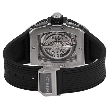 Grey titanium case with a black rubber strap. Fixed black ceramic bezel. Silver-tone dial with silver-tone hands and index hour markers. Minute markers around the outer rim. Dial Type: Analog. Date display between 4 and 5 o'clock position. Chronograph - three sub-dials displaying: 60 second, 30 minute and 12 hour. Hublot Calibre HUB4700 Automatic movement, containing 31 Jewels, composed of 278 parts, bitting at 36000 vph, and has a power reserve of approximately 50 hours. Scratch resistant sapphire crystal. Tonneau case shape, case size: 42 mm. Deployment with push button release clasp. Water resistant at 100 meters / 330 feet. Functions: chronograph, date, hour, minute, second. Additional Info: original box, international warranty card, manual (complete accessories). Spirit Of Big Bang Series. Luxury watch style. Watch label: Swiss Made. Hublot Spirit Of Big Bang Chronograph Automatic Silver Dial Men's Watch 642.NM.0170.RX.