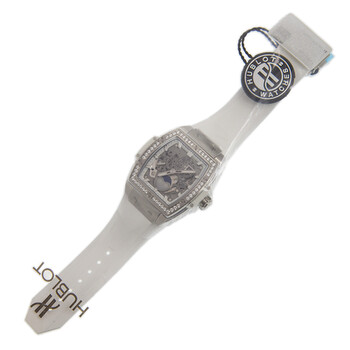 Silver-tone titanium case with a white rubber strap. Fixed set with 48 diamonds for 0.58ct bezel. Silver-tone skeleton dial with silver-tone hands and index hour markers. Minute markers around the outer rim. Dial Type: Analog. Date display at the 1 o'clock position. Three - moonphase, smal second, big date subdials. Hublot Calibre HUB1770 automatic movement with a 50-hour power reserve. Scratch resistant sapphire crystal. Transparent case back. Case size: 42 mm. Tonneau case shape. Stainless steel deployant buckle clasp. Water resistant at 100 meters / 330 feet. Functions: moon phase, big date, hour, minute. Luxury watch style. Watch label: Swiss Made. Hublot Spirit of Big Bang Moonphase Diamond Watch 647.NE.2070.RW.1204.