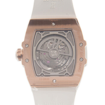 Rose 18kt king gold case with a white rubber strap. Fixed 48 diamonds for 0.58ct bezel. Silver-tone dial with silver-tone hands and index hour markers. Minute markers around the outer rim. Dial Type: Analog. Luminescent hands and markers. Date display at the 1 o'clock position. Three - moonphase, smal second, big date subdials. Hublot Calibre HUB1770 automatic movement with a 50-hour power reserve. Scratch resistant sapphire crystal. Transparent case back. Tonneau case shape. Case size: 42 mm. Deployant buckle clasp. Water resistant at 100 meters / 330 feet. Functions: moon phase, big date, hour, minute. Luxury watch style. Watch label: Swiss Made. Hublot Spirit of Big Bang Moonphase Diamond Watch 647.OE.2080.RW.1204.