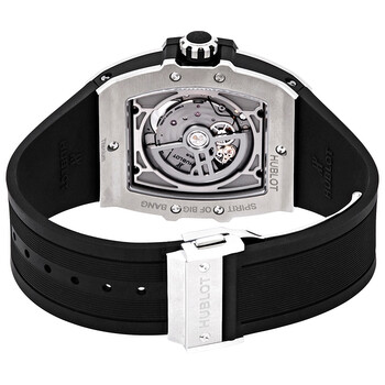 Grey titanium case with a black rubber strap. Fixed grey titanium bezel with dark shade (of finishing) recessed inlays. Black inner bezel flange. Silver (skeleton) dial with luminous silver-tone hands and index hour markers. Minute markers around the outer rim. Dial Type: Analog. Luminescent hands and markers. Date display at the 1 o'clock position. Three sub-dials displaying: moonphase and smal seconds. Hublot calibre HUB1770 automatic movement, containing 27 Jewels, bitting at 28800 vph, and has a power reserve of approximately 50 hours. Scratch resistant sapphire crystal. Push / pull crown. Transparent case back. Tonneau case shape. Case size: 42 mm. Strap width: 36 mm. Fold over clasp with a push button release. Water resistant at 100 meters / 330 feet. Functions: moon phase, big date, hour, minute. Spirit Of Big Bang Moonphase Series. Luxury watch style. Watch label: Swiss Made. Hublot Spirit of Big Bang Moonphase Watch 647.NX.1137.RX.