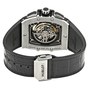 Grey satin-finished titanium case with a black rubber strap with a stiched black (alligator) leather top. Fixed grey titanium bezel. Lateral case center band and bezel lugs of black composite resin. Skeleton dial with silver-tone hands and index hour markers. Minute markers around the outer rim. Dial Type: Analog. Luminescent hands and markers. Date display between the 4 and 5 o'clock positions. Chronograph - three sub-dials displaying: 60 second, 30 minute and 12 hour. Hublot calibre HUB4700 automatic movement, containing 31 Jewels, composed of 278 parts, bitting at 36000 vph, and has a power reserve of approximately 50 hours. Scratch resistant sapphire crystal. Pull / push crown. Transparent case back. Tonneau case shape. Case dimensions: 51 mm x 45 mm. Deployment clasp with a push button release. Water resistant at 100 meters / 330 feet. Functions: chronograph, date, hour, minute, second. Spirit Of Big Bang Series. Luxury watch style. Watch label: Swiss Made. Item Variations: 601 NX 0173 LR, 601-NX-0173-LR, 601/NX/0173/LR, 601NX0173LR. Hublot Spirit of Big Bang Titanium Automatic Men's Watch 601.NX.0173.LR.