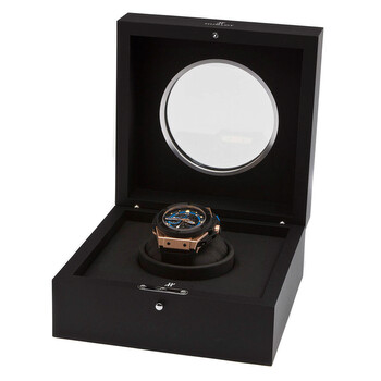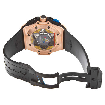 18kt rose gold case with a black leather strap. Fixed bezel. Skeleton dial with gold-toned hands and index hour markers. Minute markers around the outer rim. Dial Type: Analog. Date display between 4 and 5 o'clock position. Small seconds sub-dial. Automatic movement. Scratch resistant sapphire crystal. Case diameter: 48 mm. Round case shape. Water resistant at 100 meters / 330 feet. Functions: date, hour, minute, second. Dress watch style. Watch label: Swiss Made. Hublot UEFA Euro 2012 Ukraine 18kt Rose Gold and Rubber Men's Watch 716OM1129RXEUR12.