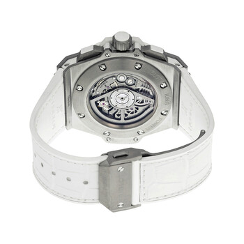 Grey titanium case with a white leather strap. Fixed titanium and white rubber bezel. Skeleton dial with luminous silver-tone hands and index hour markers. Minute markers around the outer rim. Dial Type: Analog. Luminescent hands and markers. Date display between 4 and 5 o'clock position. Two sub-dials displaying: small second and power reserve indicator. Hublot Calibre HUB1240 Automatic movement, containing 38 Jewels, composed of 330 parts, bitting at 28800 vph, and has a power reserve of approximately 72 hours. Scratch resistant sapphire crystal. Transparent case back. Round case shape, case size: 48 mm. Band width: 25.40 mm, band length: 8 inches. Fold over clasp. Water resistant at 100 meters / 330 feet. Functions: chronograph, date, hour, minute, second. King Power Unico Series. Casual watch style. Watch label: Swiss Made. Item Variations: 701 NE 0127 GR, 701-NE-0127-GR, 701/NE/0127/GR, 701NE0127GR. Hublot Unico Automatic Chronograph Skeleton Dial Men's Watch 701.NE.0127.GR.