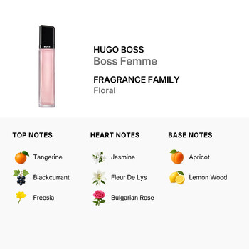 Boss Femme opens with a refreshing burst of tangerine, blackcurrant, and freesia, creating an inviting and lighthearted introduction. At its heart, rich florals like jasmine, fleur de lys, and Bulgarian rose bloom gracefully, adding charm and sophistication. The fragrance gently settles into a warm base of apricot and lemon wood, leaving a smooth, lasting impression that whispers confidence and grace.