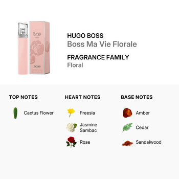 Boss Ma Vie Florale opens with the refreshing and unique top note of cactus flower, creating a crisp and vibrant first impression. As the fragrance unfolds, delicate heart notes of freesia, jasmine sambac, and rose bloom beautifully, adding a soft, romantic touch that feels both graceful and empowering. The base notes of amber, cedar, and sandalwood provide a warm, lasting finish that lingers with sophistication.