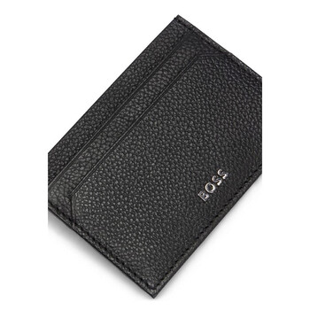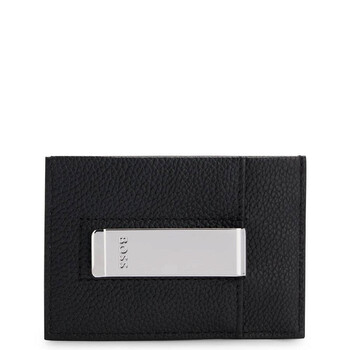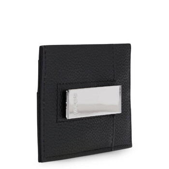 Hugo Boss Men's Wallets. SKU: 50499247-001. Color: Black. Size: L: 3.9 in × H: 2.8 in. Hugo Boss Logo Detailed Grained-Leather Wallet. This wallet features a money clip in polished brass, grained leather with metal logo lettering, polished silver hardware, and two credit card slots. 100% Cow leather, Lining: 100% Polyester, Facing: 100% Brass.