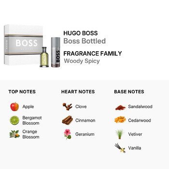 Boss Bottled opens with vibrant top notes of crisp Apple, Bergamot blossom, and Orange blossom, delivering an energizing first impression. At its heart, warm hints of Clove, spicy Cinnamon, and fresh Geranium create a balanced blend of depth and character. The fragrance settles into a rich base of Sandalwood, Cedarwood, earthy Vetiver, and smooth Vanilla, creating a lasting scent that is both masculine and refined.