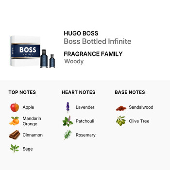 Boss Bottled Infinite opens with refreshing top notes of crisp apple and juicy mandarin orange, blended seamlessly with spicy cinnamon and aromatic sage. As the scent unfolds, it reveals a heart of calming lavender, earthy patchouli, and invigorating rosemary—creating a harmonized blend of freshness and warmth. Finally, the base notes of rich sandalwood and rare olive tree leave a lasting impression of depth and masculinity.