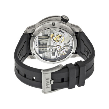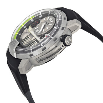 Grey titanium case with a black rubber strap. Fixed grey titanium bezel. Grey dial with luminous hands and index hour markers. Arabic numerals mark the 6 and 12 o'clock positions. minute markers around the outer rim. Dial Type: Analog. One subdial displaying: power reserve indicator. HYT Calibre Exclusive Hand Wind movement, containing 35 Jewels, bitting at 28800 vph, and has a power reserve of approximately 192 hours. Scratch resistant sapphire crystal. Transparent case back. Round case shape, case size: 48.80 mm, case thickness: 17.9 mm. Tang clasp. Water resistant at 100 meters / 330 feet. Functions: hour, minute, second. Additional Info: hydro fluid system in a closed, waterproof circuit indicates the hour. H1 Titanium Series. Luxury watch style. Watch label: Swiss Made. Item Variations: 148 TT 11 GF RU, 148.TT.11.GF.RU, 148TT11GFRU. HYT H1 TItanium Grey Dial Mechanical Black Rubber Men's Watch 148-TT-11-GF-RU.