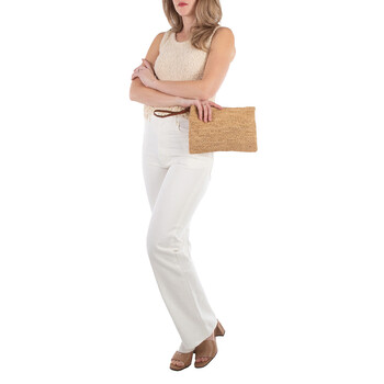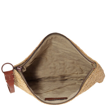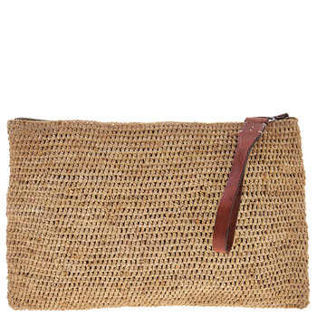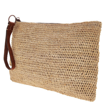 Ibeliv Ladies Clutch. SKU: AMPY-TEA. Barcode: 3760368820753. Color: Beige. Size: 30 cm long x 22 cm high. Ibeliv Ampy Clutch Bag. The AMPY raffia pouch features a zip-top fastening that opens to a spacious main compartment. It comes with a leather strap and is finished with elegant saddle stitching for a refined touch.