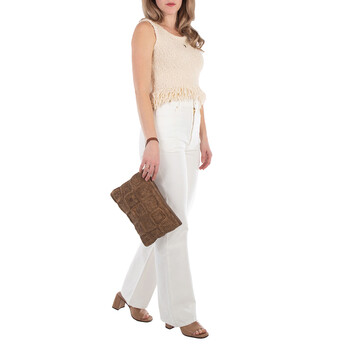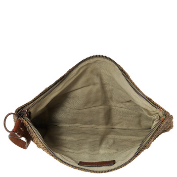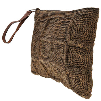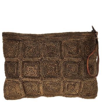 Ibeliv Ladies Clutch. SKU: TANALA-DARK TEA. Barcode: 3760368820692. Color: Brown. Ibeliv Raffia Tanala Clutch. Made of woven raffia, this bag features a leather handle, a top zipper closure, and a single spacious compartment for your essentials. 100% Raffia.