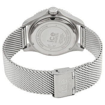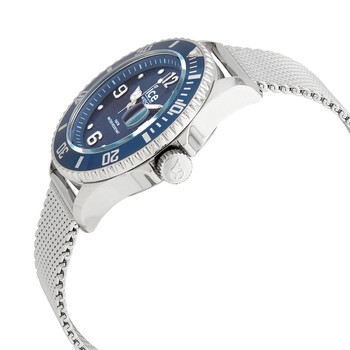 Stainless steel case with a stainless steel mesh bracelet. Uni-directional rotating stainless steel bezel with an inlaid blue ring. Blue dial with luminous silver-tone hands and dot hour markers. Arabic numerals appear at the 6, 9 and 12 o'clock positions. Minute markers around the outer rim. Dial Type: Analog. Luminescent hands and markers. Date display at the 3 o'clock position. Quartz movement. Scratch resistant mineral crystal. Pull / push crown. Solid case back. Round case shape. Case size: 40 mm. Case thickness: 12 mm. Band width: 20 mm. Fold over slip through clasp. Water resistant at 100 meters / 330 feet. Functions: date, hour, minute, second. Sport watch style. Watch label: Japan Movt. Ice Quartz Blue Dial Stainless Steel Mesh Men's Watch 017667.