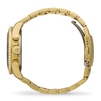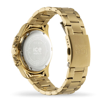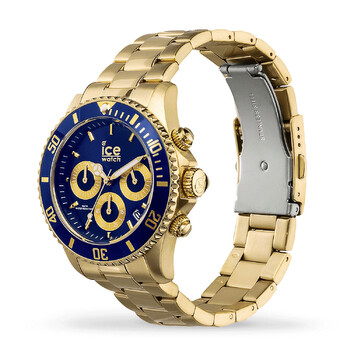 Gold-tone stainless steel case and bracelet. Uni-directional rotating gold-tone stainless steel with an inlaid blue ring bezel. Blue dial with luminous gold-tone hands and index hour markers. Minute markers around the outer rim. Dial Type: Analog. Luminescent hands and markers. Date display between the 4 and 5 o'clock positions. Chronograph - three sub-dials displaying: 60 second, 30 minute and 24 hour. Quartz movement. Scratch resistant mineral crystal. Pull / push crown. Solid case back. Round case shape, case size: 40 mm, case thickness: 12 mm. Band width: 20 mm. Deployment clasp. Water resistant at 100 meters / 330 feet. Functions: chronograph, date, hour, minute, second. Sport watch style. Watch label: Japan Movt. Ice-Watch Chronograph Blue Dial Men's Watch 017674.