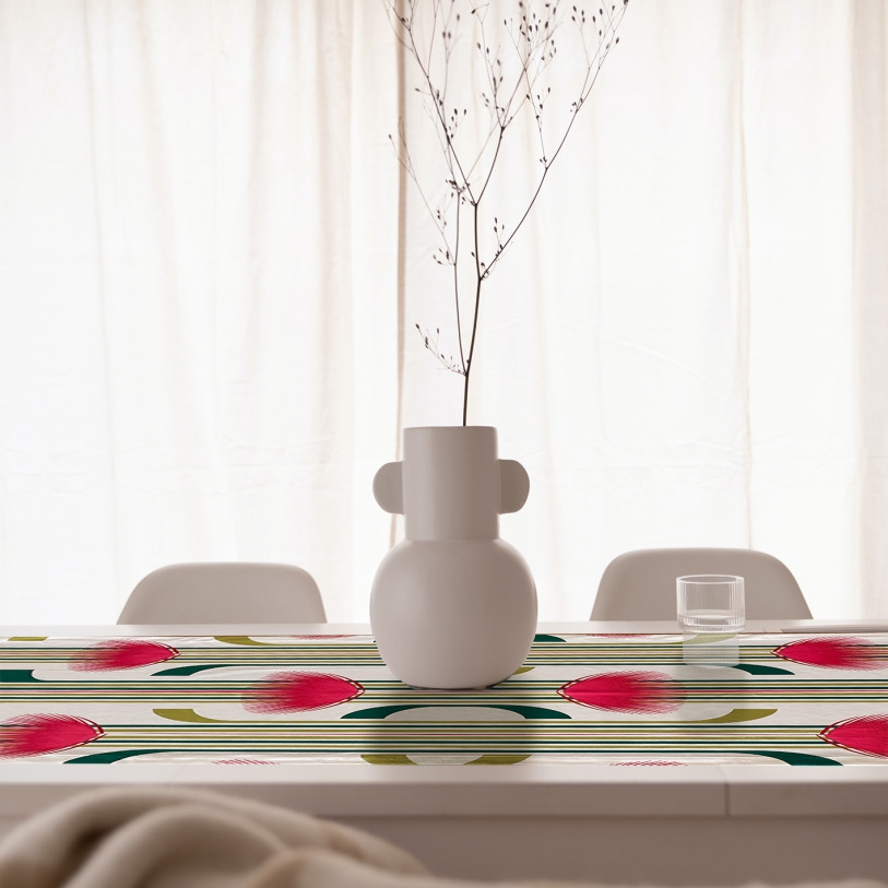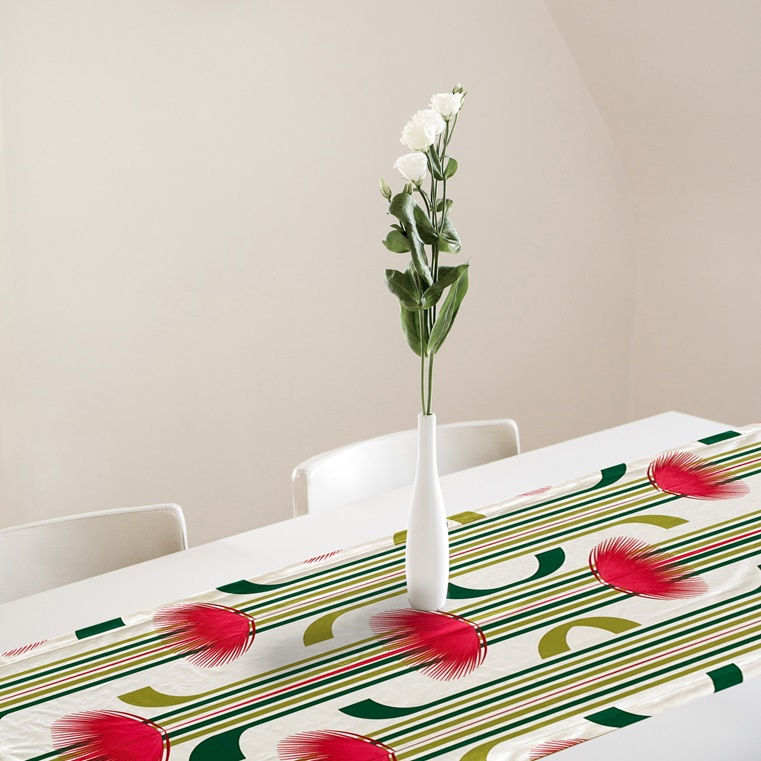 ID Vision-ის გამორჩეული დიზაინის მქონე რანერი. ყველა ორნამენტი არის ხელით დახატული, ციფრულად დამუშავებული სხვადასხვა პროგრამის გამოყენებით და გადატანილია სუბლიმაციური ბეჭდვის მეთოდით ქსოვილზე. მოვლის წესები: რეცხვა შეიძლება ხელით ან 30 გრადუსზე სარეცხ მანქანაში, გაუთოება - დაბალ გრადუსზე. არ გამოიყენოთ მათეთრებელი.