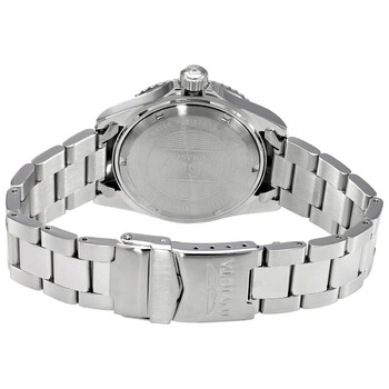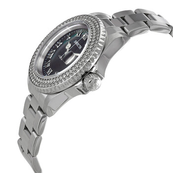 Stainless steel case with a stainless steel bracelet. Fixed stainless steel bezel set with crystals. Black mother of pearl dial with luminous silver-tone hands and Roman numeral hour markers. Minute markers around the outer rim. Dial Type: Analog. Luminescent hands. Date display at the 3 o'clock position. Ronda caliber 515 quartz movement. Scratch resistant mineral crystal. Screw down crown. Solid case back. Round case shape. Case size: 40 mm. Case thickness: 13.5 mm. Band width: 20 mm. Fold over clasp. Water resistant at 200 meters / 660 feet. Functions: date, hour, minute, second. Angel Series. Dress watch style. Watch label: Swiss Movt. Invicta Angel Black Mother of Pearl Dial Ladies Watch 21711.