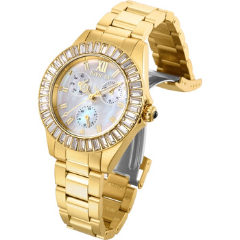 Yellow gold-tone stainless steel case and bracelet. Fixed yellow gold-tone bezel set with baguette crystals. Mother of pearl dial with luminous yellow gold-tone hands and index hour markers. A Roman numeral marks the 12 o'clock position. Dial Type: Analog. Luminescent hands and markers. Three sub-dials displaying: date, day of the week and 24 hour. Caliber VH68 quartz movement. Scratch resistant mineral crystal. Pull / push crown. Solid case back. Round case shape. Case size: 38 mm. Case thickness: 11.8 mm. Band width: 20 mm. Fold over clasp with a safety release. Water resistant at 100 meters / 330 feet. Functions: date, day, GMT, second time zone, hour, minute, second. Angel Series. Dress watch style. Watch label: Japan Movt. Invicta Angel Crystal Mother of Pearl Dial Ladies Watch 28452.