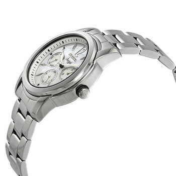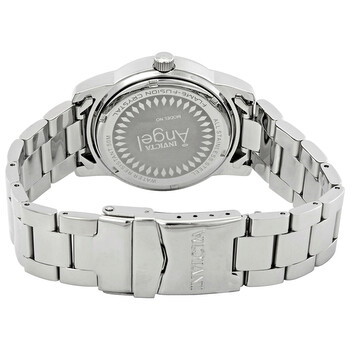 Stainless steel case with a stainless steel bracelet. Fixed stainless steel bezel. Mother of pearl dial with silver-tone hands and index hour markers. An Arabic numeral appears at the 12 o'clock positions. Minute markers around the outer rim. Dial Type: Analog. Luminescent hands and markers. Three multi-function sub-dials displaying: 24 hour, date and day of the week. ISA caliber 9238/1970 quartz movement. Scratch resistant flame fusion crystal. Pull / push crown. Solid case back. Round case shape. Case size: 38 mm. Case thickness: 11 mm. Band width: 20 mm. Band length: 7.85 inches. Fold over clasp with a safety release. Water resistant at 50 meters / 165 feet. Functions: date, day, hour, minute, second, 24 hours. Casual watch style. Invicta Angel Multi-Function Mother of Pearl Dial Ladies Watch 0463.