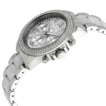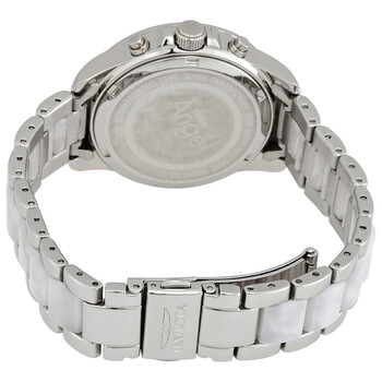 Stainless steel case with a stainless steel and pearl tortoise-shell bracelet. Fixed stainless steel bezel set with crystals. Silver crystal-set dial with luminous silver-tone hands and index hour markers. Roman numerals mark the 4, 8 and 12 o'clock positions. Minute markers around the outer rim. Dial Type: Analog. Luminescent hands and markers. Three multi-function sub-dials displaying: 24 hour, date and day of the week. Quartz movement. Scratch resistant flame fusion crystal. Pull / push crown. Solid case back. Case diameter: 38 mm. Round case shape. Band width: 18 mm. Band length: 7.6 inches. Fold over clasp with safety release. Water resistant at 100 meters / 330 feet. Functions: date, day, hour, minute, second, 24 hour. Casual watch style. Invicta Angel Multi-Function Silver Crystal-set Stainless Steel and Pearl Tortoise-shell Ladies Watch 20507.