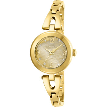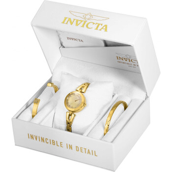 Yellow gold-tone stainless steel case and bracelet. Fixed yellow gold-tone bezel. Gold mother of pearl dial with yellow gold-tone hands and crystal hour markers. Arabic numerals mark the 3, 6, 9 and 12 o'clock positions. Dial Type: Analog. Hattori caliber PC21 quartz movement. Scratch resistant flame fusion crystal. Pull / push crown. Solid case back. Round case shape. Case size: 28 mm. Case thickness: 12 mm. Band width: 12 mm. Band length: 6.5 inches. Jewelry clasp. Water resistant at 100 meters / 330 feet. Functions: hour, minute, second. Additional Info: set includes two bangle bracelets. Angel Series. Casual watch style. Watch label: Japan Movt. Invicta Angel Quartz Crystal Gold Dial Ladies Watch and Bracelet Set 29331.