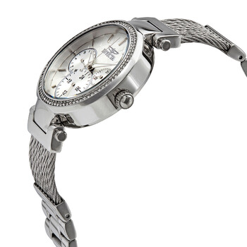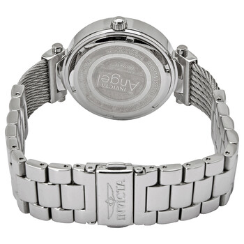 Stainless steel case with a stainless steel bracelet with cable wire inserts. Fixed stainless steel bezel set with crystals. Silver dial with silver-tone alpha-style hands and index hour markers. Dial Type: Analog. Date display at the 3 o'clock position. Three multi-function sub-dials displaying: date, day of the week and 24 hour. TMI caliber VH63 quartz movement. Scratch resistant Flame Fusion crystal. Pull / push crown. Solid case back. Round case shape. Case size: 36 mm. Case thickness: 10.5 mm. Band width: 18 mm. Band length: 6.75 inches. Fold over clasp. Water resistant at 100 meters / 330 feet. Functions: date, day, GMT, second time zone, hour, minute, second. Angel Series. Dress watch style. Watch label: Japan Movt. Invicta Angel Quartz Crystal Silver Dial Ladies Watch 28915.