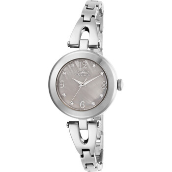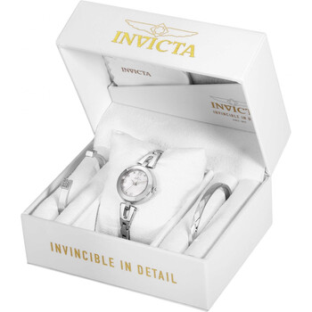 Stainless steel case with a stainless steel bracelet. Fixed stainless steel bezel. White mother of pearl dial with silver-tone hands and crystal hour markers. Arabic numerals mark the 3, 6, 9 and 12 o'clock positions. Dial Type: Analog. Hattori caliber PC21 quartz movement. Scratch resistant flame fusion crystal. Pull / push crown. Solid case back. Round case shape. Case size: 28 mm. Case thickness: 12 mm. Band width: 12 mm. Band length: 6.5 inches. Jewelry clasp. Water resistant at 100 meters / 330 feet. Functions: hour, minute, second. Additional Info: set includes two bangle bracelets. Angel Series. Casual watch style. Watch label: Japan Movt. Invicta Angel Quartz Crystal White Mother of Pearl Dial Ladies Watch and Bracelet Set 29330.
