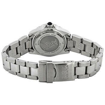 Stainless steel case with a stainless steel bracelet. Fixed stainless steel bezel set with crystals. Silver crystal-set dial with luminous blue hands and index hour markers. Minute markers around the outer rim. Dial Type: Analog. Date display at the 3 o'clock position. Ronda caliber 585 quartz movement. Scratch resistant mineral crystal. Pull / push crown. Solid case back. Round case shape. Case size: 30 mm. Case thickness: 11 mm. Band width: 16 mm. Fold over clasp with a safety release. Water resistant at 100 meters / 330 feet. Functions: date, hour, minute, second. Angel Series. Dress watch style. Watch label: Swiss Movt. Invicta Angel Silver Crystal-set Dial Ladies Watch 28439.